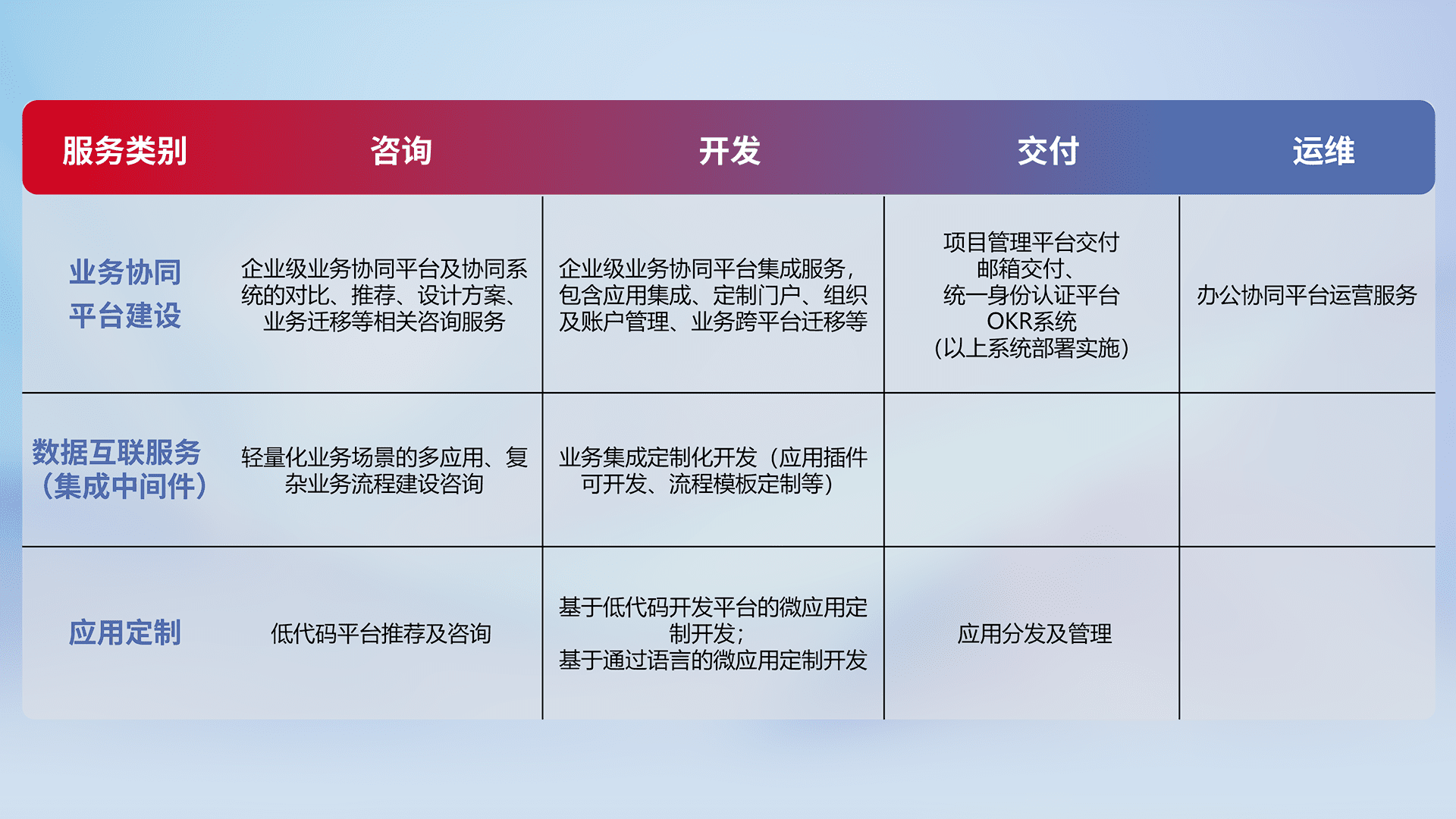 针对钉钉、、、企微、、、IDaas等平台级产品提供产品的规划、、、、方案、、、、交付、、、定制化开发等服务,,,实现如统一协同办公、、、、智能客户服务、、混合会议管理、、智能数据查询、、、等业务场景,,实现数字化转型。。。。
